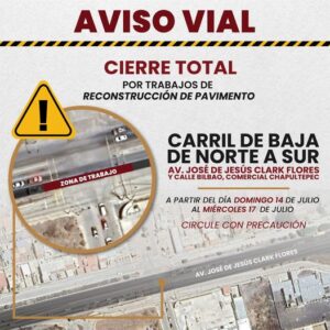 Ensenada, B.C.- Jueves 11 de julio de 2024.-* A partir del domingo 14 de julio, el Gobierno de Ensenada implementará un cierre vial completo en el crucero de la avenida José de Jesús Clark Flores y Calle Bahía Asunción, colonia Moderna.