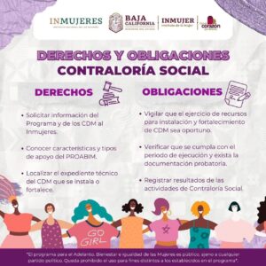 Tijuana, Baja California a 23 de julio de 2024.- El Instituto de la Mujer para el Estado de Baja California (INMUJER BC), informa que está abierta la convocatoria para la integración de los Comités de Contraloría Social de los Centros de Desarrollo para las Mujeres (CDM) del Programa para el Adelanto, Bienestar e Igualdad de las Mujeres (PROABIM).