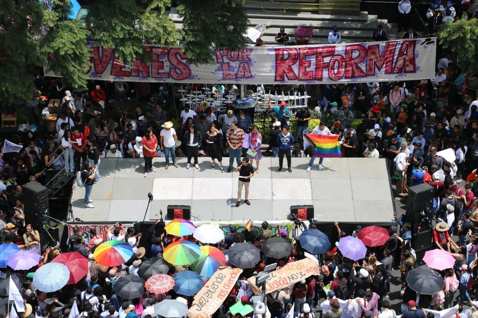 Miles de estudiantes se concentraron al medio día frente a la Suprema Corte de Justicia de la Nación para respaldar la aprobación de la Reforma al Poder Judicial. Desde las 10 horas, contingentes del Politécnico Nacional se aglutinaron frente al monumento de la mexicanidad, seguidos por los representantes de la Autónoma de Guerrero. Previo al inicio del evento, se dio un performance sobre el templete instalado frente a la Corte. Al grito de: “Democracia sí, sabadazos no”, manifestantes mostraron su respaldo a la Reforma Judicial.