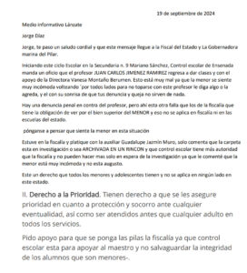 ÉSTE MEDIO DE COMUNICACIÓN RECIBIÓ EL SIGUIENTE DOCUMENTO ASI COMO TAMBIÉN EL NÚMERO DE EXPEDIENTE DE DENUNCIA Y/O DEMANDA EN CONTRA DE UN MAESTRO QUE TRABAJA EN LA ESCUELA SECUNDARIA NÚMERO 9 “MARIANO SÁNCHEZ”