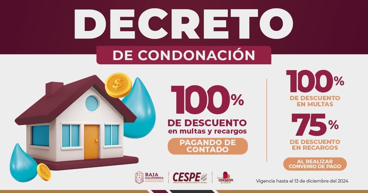 ENSENADA.- La Comisión Estatal de Servicios Públicos de Ensenada (CESPE) informa que continúa vigente el Decreto de Condonación de Multas y Recargos a fin de brindar las facilidades para ponerse al corriente en el servicio de agua a quienes, por alguna razón, presentan adeudo en su recibo.
