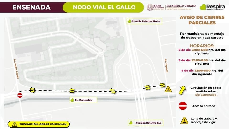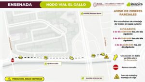Explicó que los cierres se llevarán a cabo en el lapso de las 22:00 a las 6:00 horas de los días antes mencionados, comenzando la noche del 2 de diciembre a las 22:00 horas para concluir la mañana del martes 3 de diciembre a las 6:00 horas, para llevar a cabo maniobras de forma segura y con impacto mínimo en el tránsito, por lo que hizo un llamado a los ciudadanos a mantener la precaución al transitar por la zona.