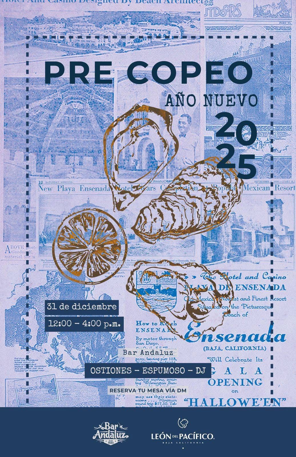 Ensenada, B. C.- Martes 24 de diciembre de 2024.-* Con el objetivo de promover el producto de la región y el turismo local, el Centro Social, Cívico y Cultural Riviera, a través del tradicional Bar Andaluz, llevará cabo el “Precopeo Año Nuevo 2025”, con ostiones, vino espumoso y música el día 31 de diciembre, de 12:00 a 16:00 horas.