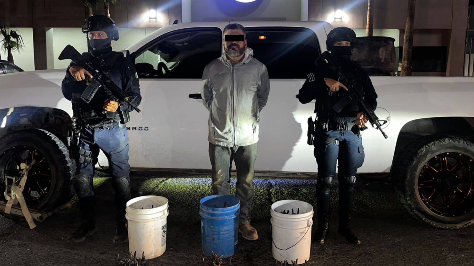 El hombre se identificó ante los agentes como Juan Francisco “N” originario de Mexicali, a quien se le realizó una inspección preventiva sin encontrarle objetos sospechosos entre sus pertenencias, sin embargo, en la cabina de la camioneta que dijo era de su prioridad, se localizaron tres cubetas llenas de “poncha llantas”.