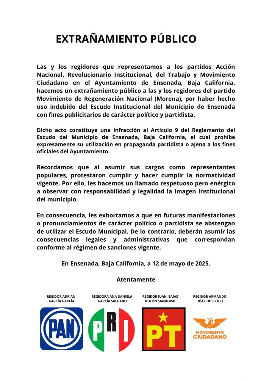 Las y los regidores que representamos a los partidos Acción Nacional, Revolucionario Institucional, del Trabajo y Movimiento Ciudadano en el Ayuntamiento de Ensenada, Baja California, hacemos un extrañamiento público a las y los regidores del partido Movimiento de Regeneración Nacional (Morena), por haber hecho uso indebido del Escudo Institucional del Municipio de Ensenada con fines publicitarios de carácter político y partidista.