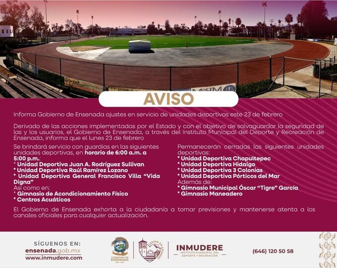 Informa Gobierno de Ensenada ajustes en servicio de unidades deportivas este 23 de febrero