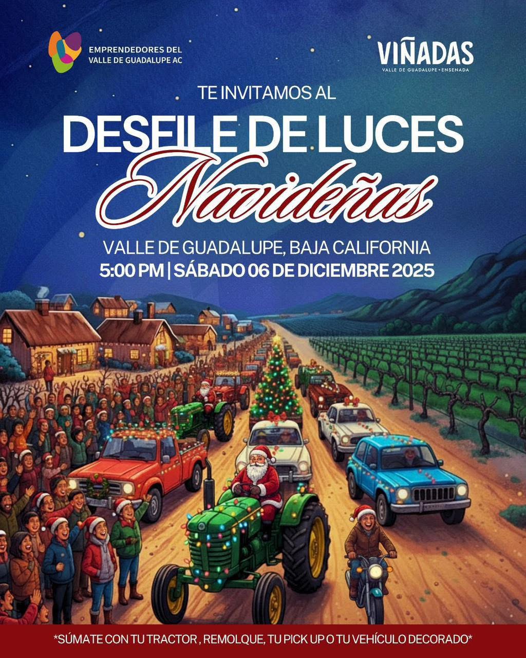 El próximo *sábado 06 de diciembre*, a partir de las 5:00 PM, el Valle de Guadalupe se vestirá de luz y alegría con nuestro Gran Desfile de Luces Navideñas.